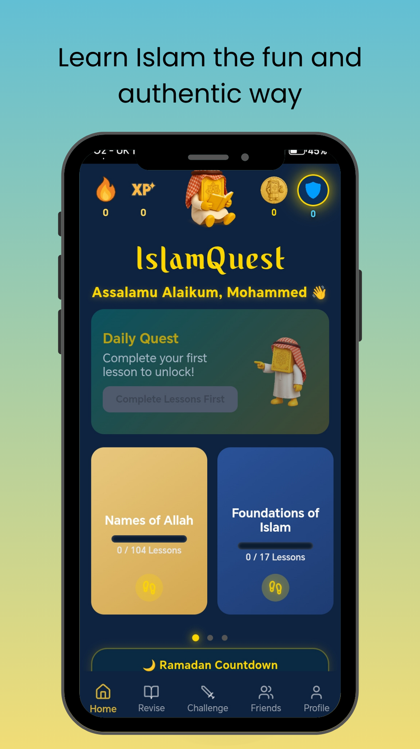 IslamQuest is a fun and engaging Islamic learning app designed to help you grow your knowledge step-by-step. Study authentic Islamic content, test yourself with interactive quizzes, compete with friends and take part in global learning challenges — all in one place. Whether you're just starting or refreshing your knowledge, IslamQuest makes learning rewarding, social and enjoyable.
