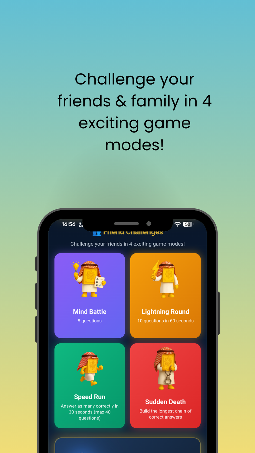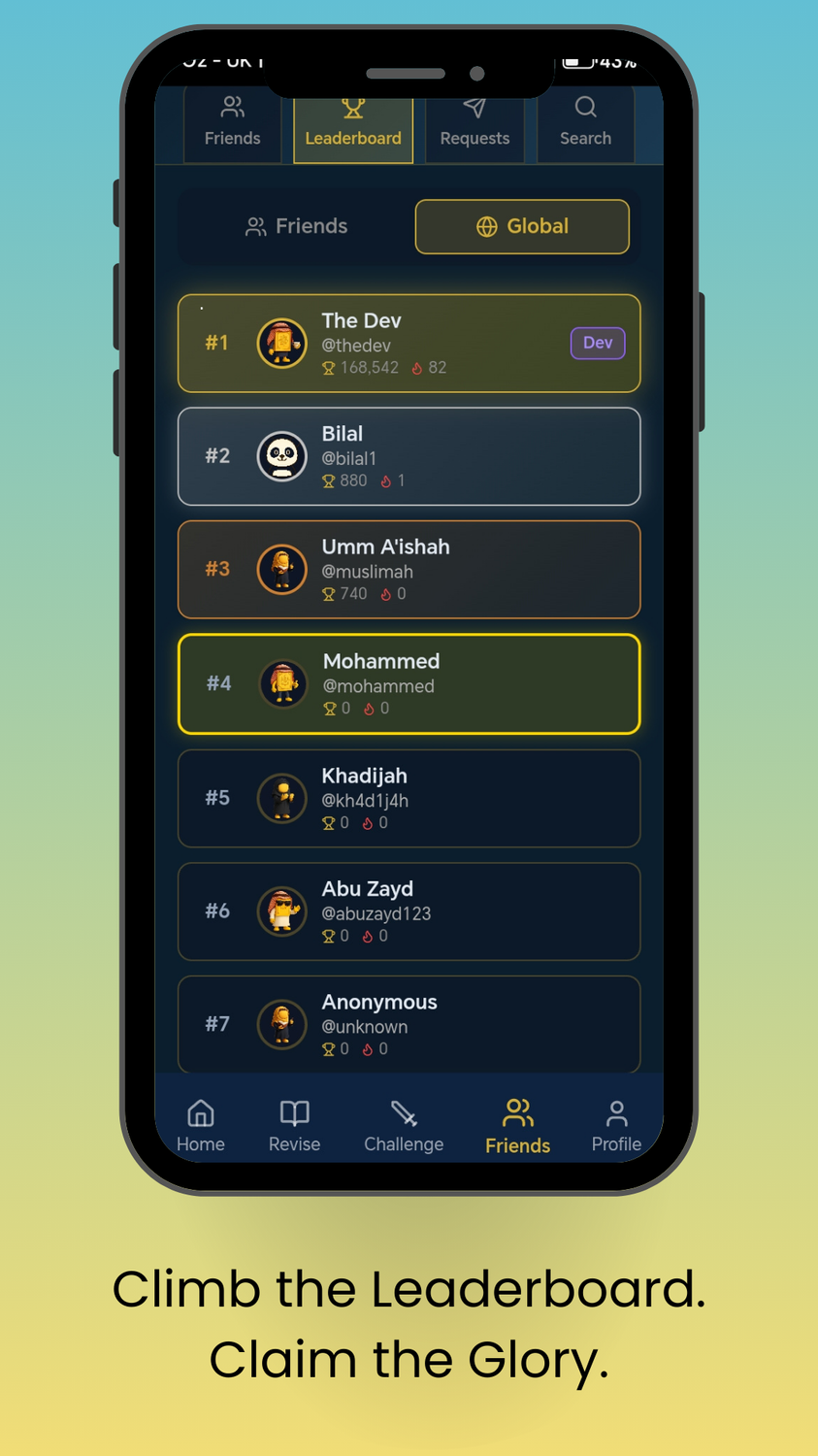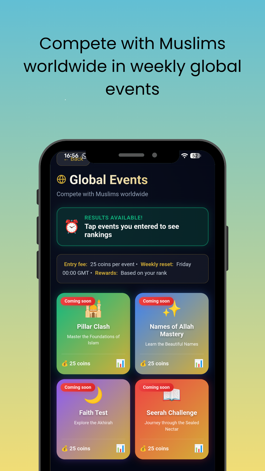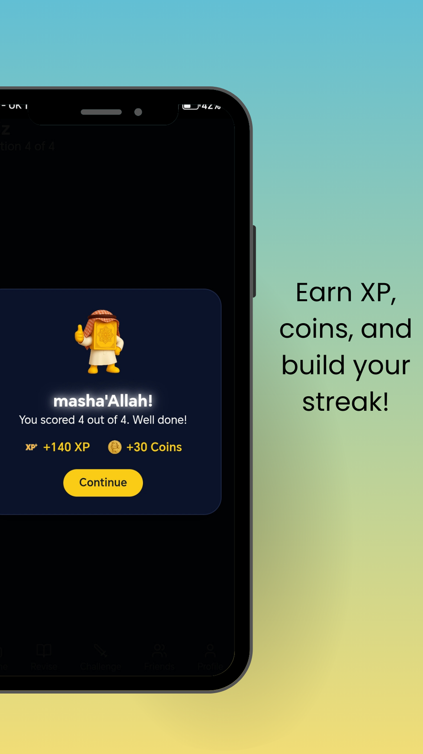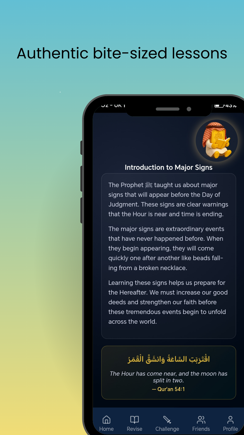Bite-sized lessons, quizzes, friend challenges and global competitions — all built on authentic Islamic sources.