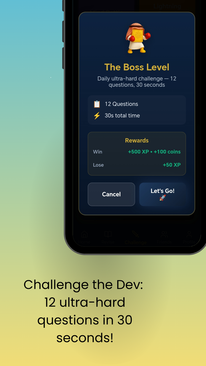 Participate in lesson quizzes, 1v1 friend battles and global competitions while earning XP and coins.